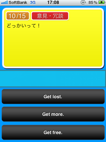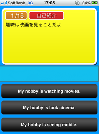 ペラペラ英会話を起動したら、「スタート」をタップして活きた英語を学び始めましょう。問題は全て15問あり、「会えるのを楽しみにしているよ。」などの表現に当てはまる英会話を3択の中から選択するだけなので、片手で簡単に操作ができます。このアプリでの英会話表現は全500件用意されており、基本である「挨拶」から旅行で役立つ「食事」や「映画・旅行」などで使う英会話など、全10種類のシチュエーションに沿った英会話を一気に学ぶことができます。
